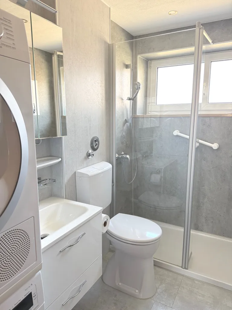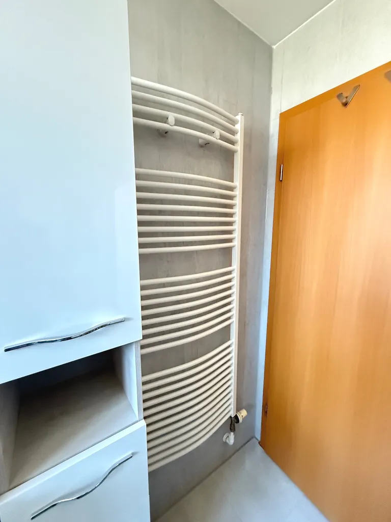 Die Etagenwohnung besticht durch ihre funktionalen Räumlichkeiten und ihr helles, freundliches Ambiente. Die beiden Schlafzimmer bieten ausreichend Platz für eine kleine Familie oder Paare. Das Badezimmer ist modern ausgestattet und verfügt über eine bodenbündige Dusche und einen zusätzlichen Handtuchheizkörper.