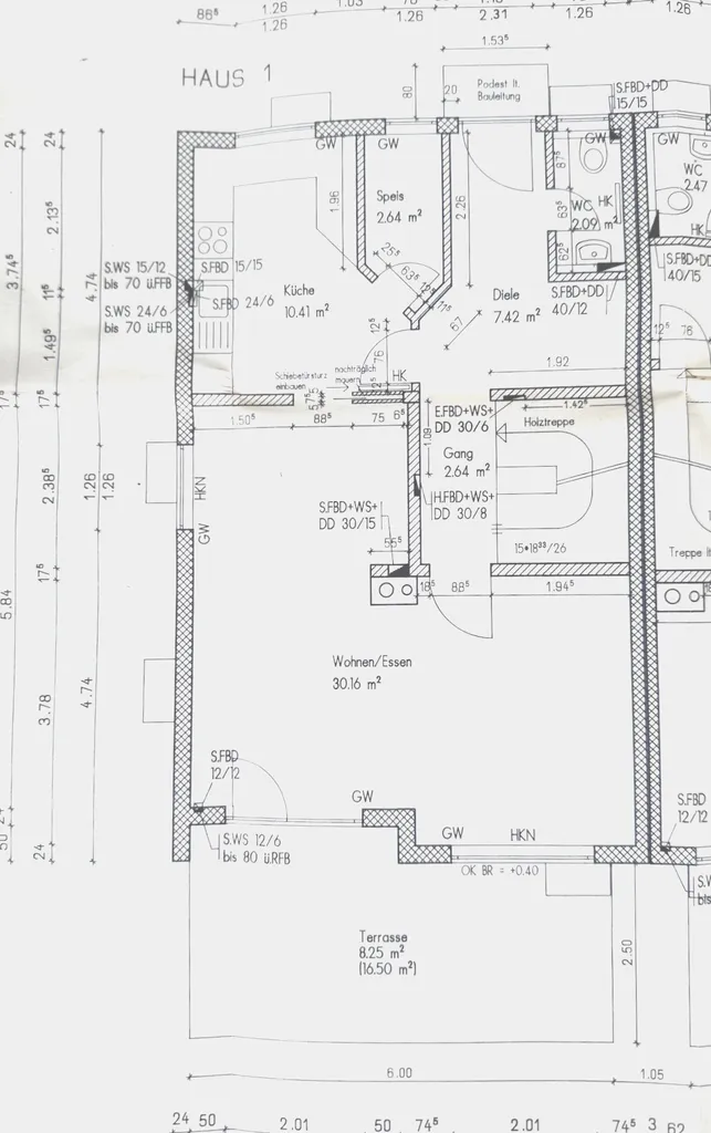 -Erdgeschoß: Wohn-/Esszimmer, *Küche, Speisekammer, Gäste-WC, Flur/Diele