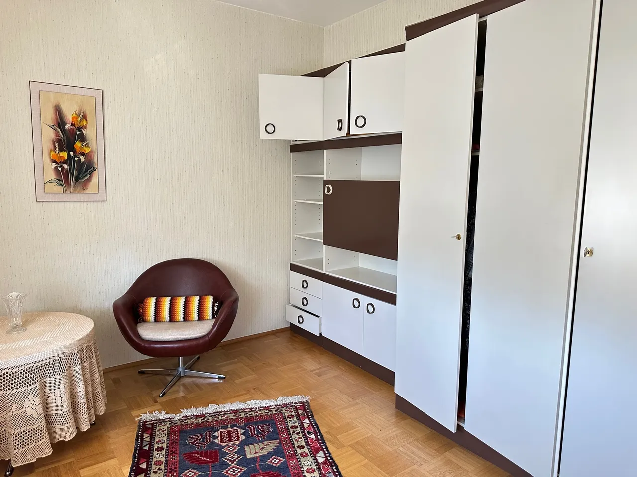 Die Böden sind aktuell mit Teppich, Parkett oder Steinzeug belegt.